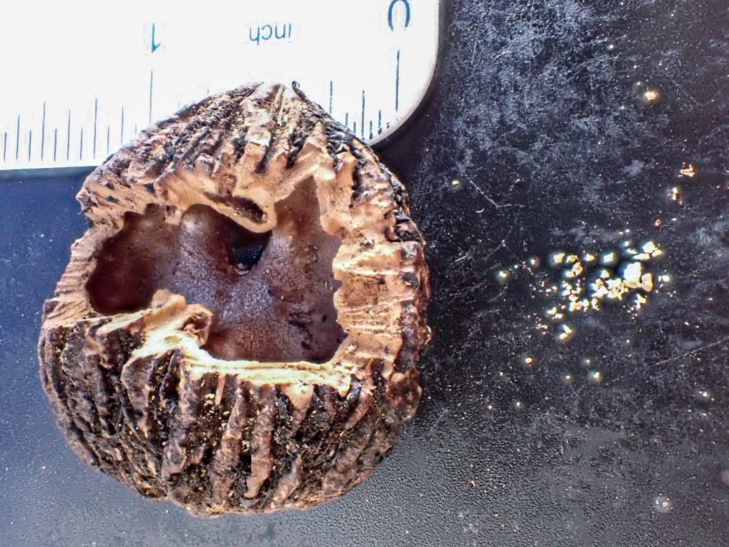 Red squirrels open both sides of the walnut and most of the time the shell stays intact. The shell opened by a red squirrel is shown alongside some of the nutmeat debris left behind.