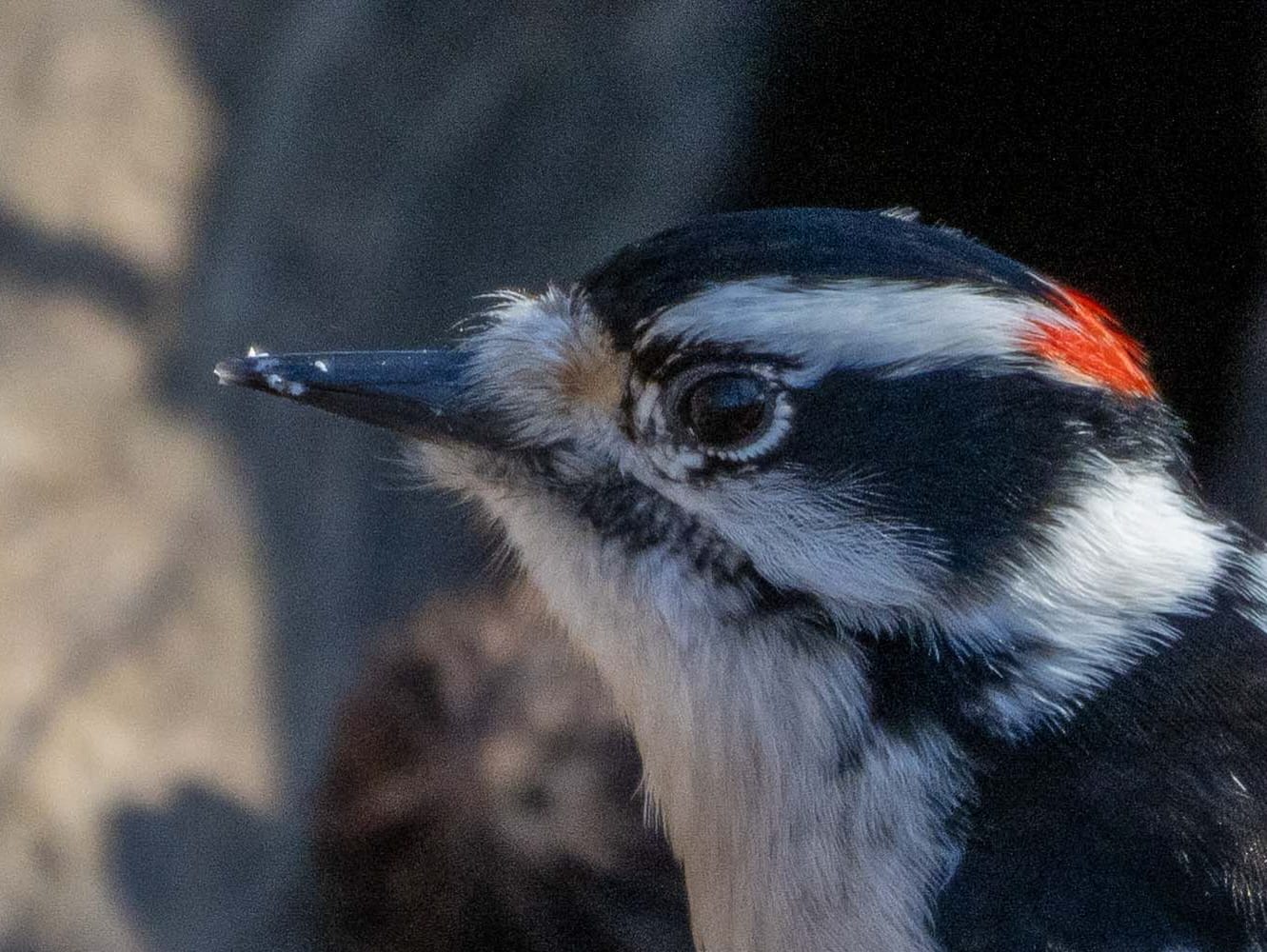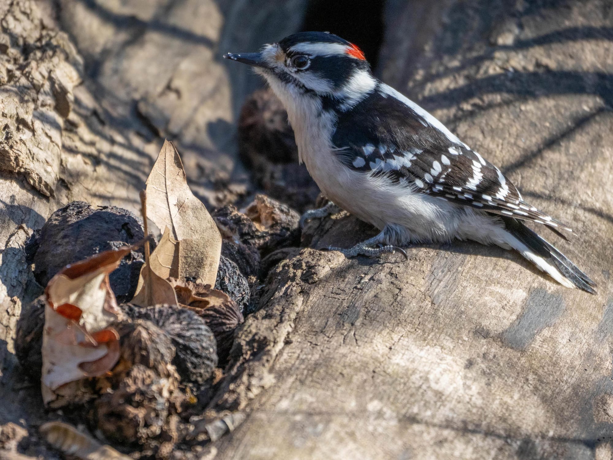 This downy woodpecker is gleaning the bits of nutmeat left behind in a black walnut shell. The close-up shows the fragments of nutmeat on the bird's bill.