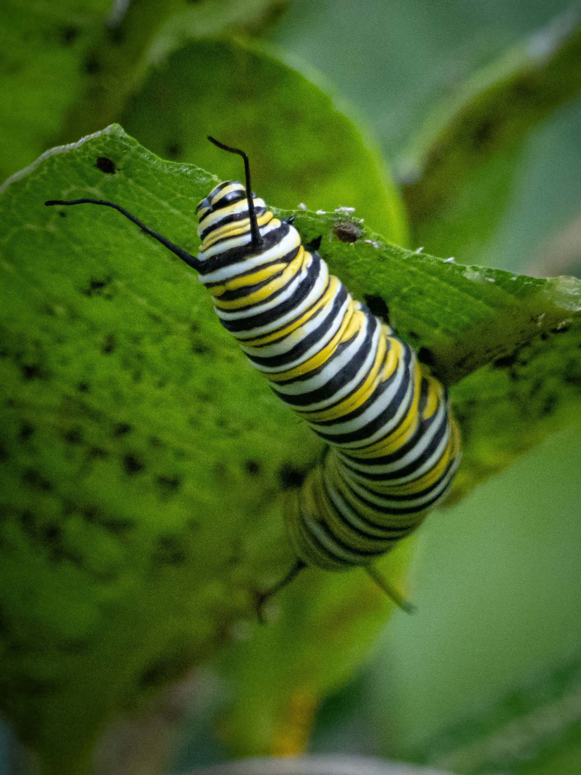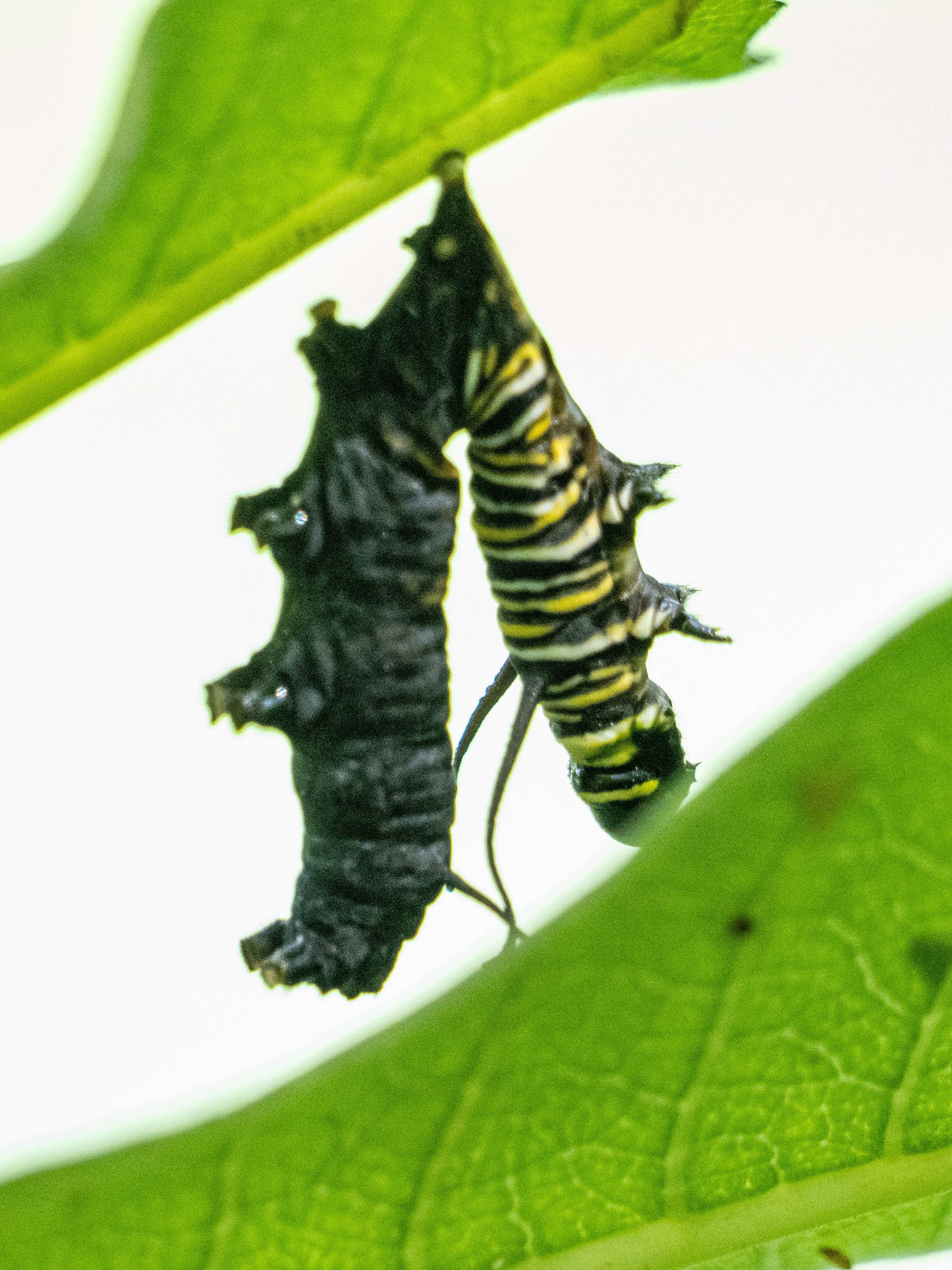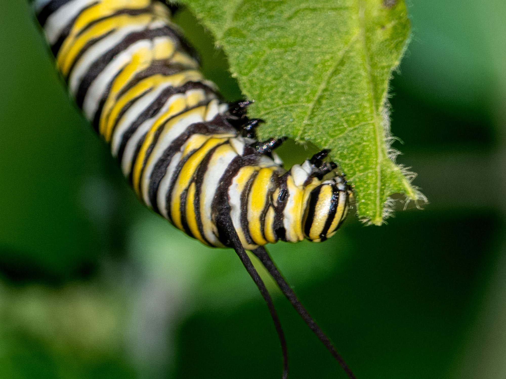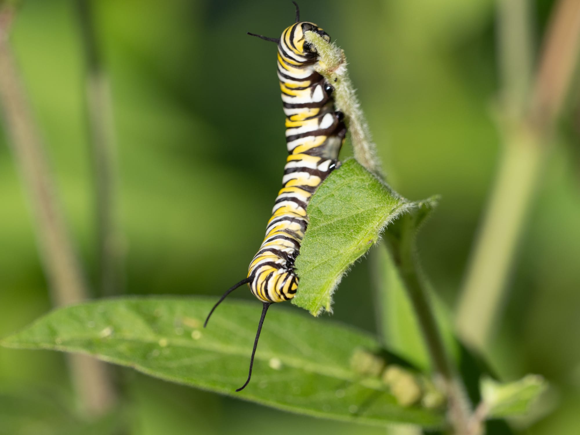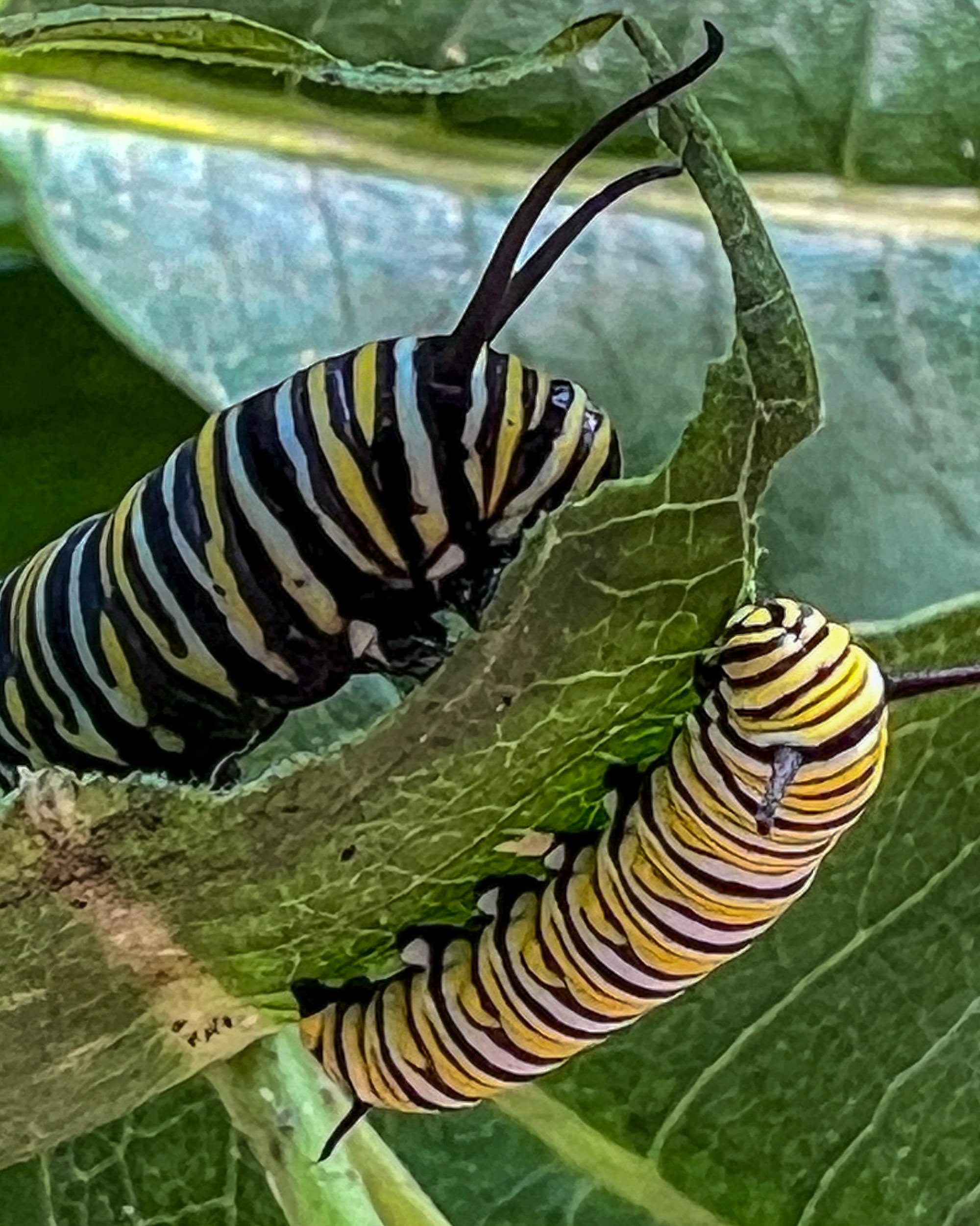 Monarch caterpillars feed exclusively on milkweed leaves. A molting caterpillar, and a comparison of two stages of caterpillar growth.