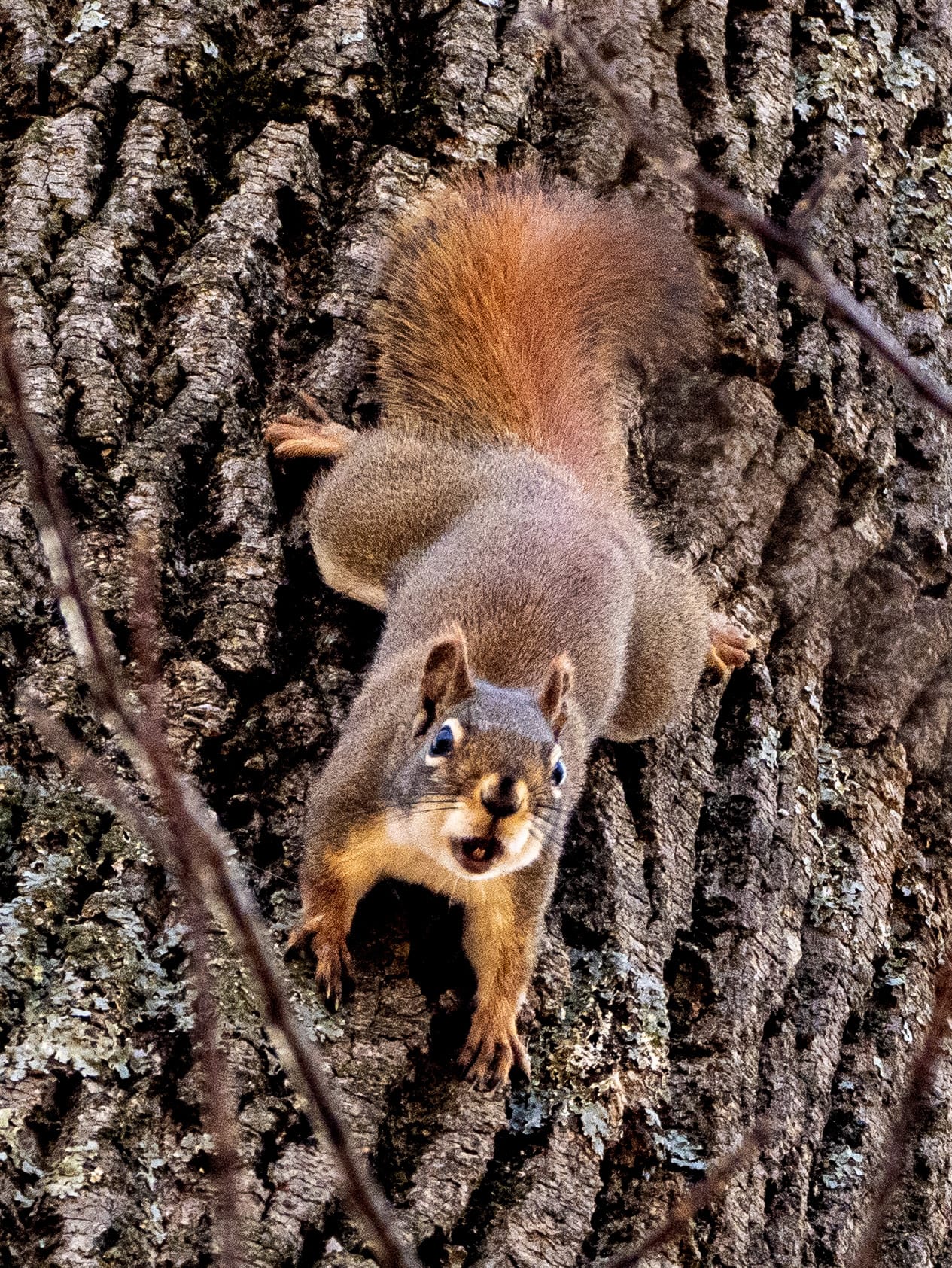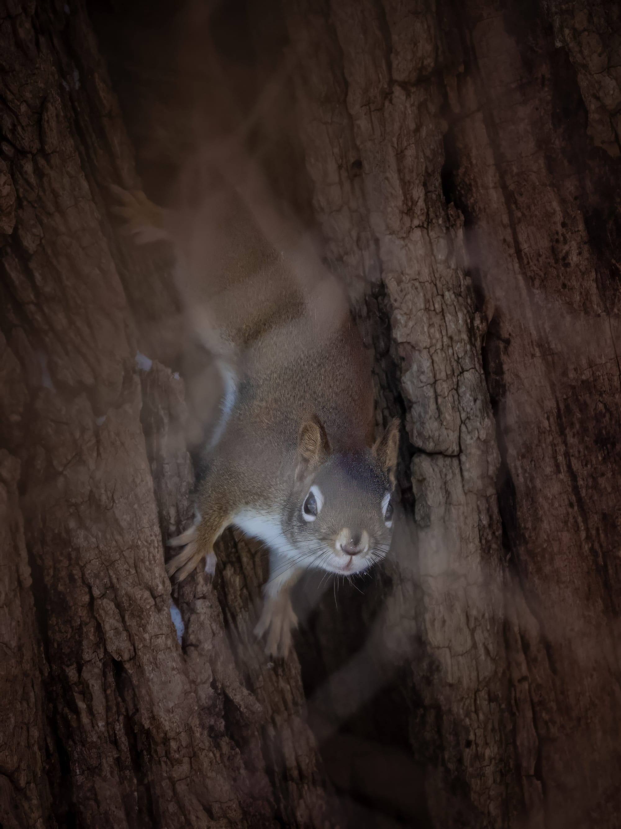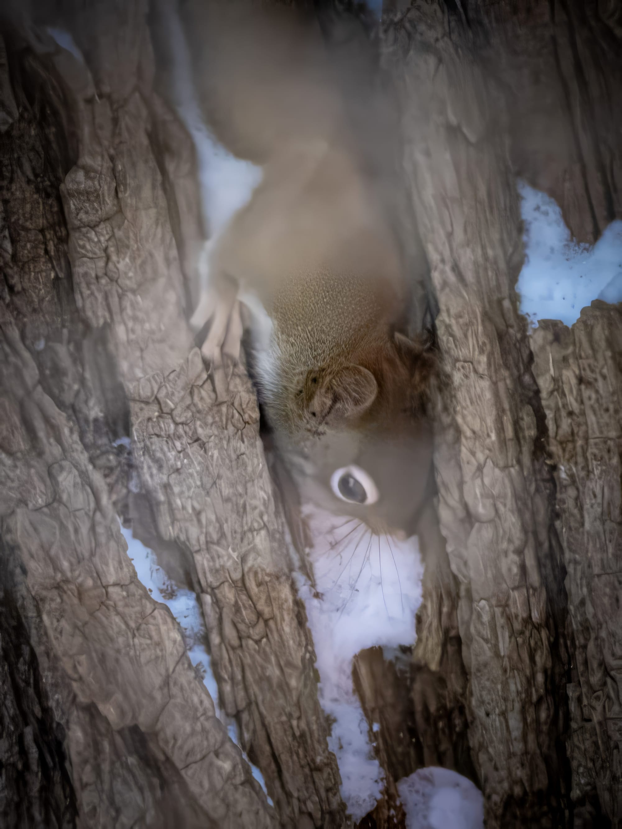 Winter is when Red Squirrels are their squirreliest. The first one was giving me a pretty good chewing-out for being a little too close for comfort. They are enjoying the black walnuts, stashing them everywhere. The final two pictures are a Red Squirrel in what looks like an roomy, comfortable split locust tree. As we were watching each other they took some time to get a drink of snow.