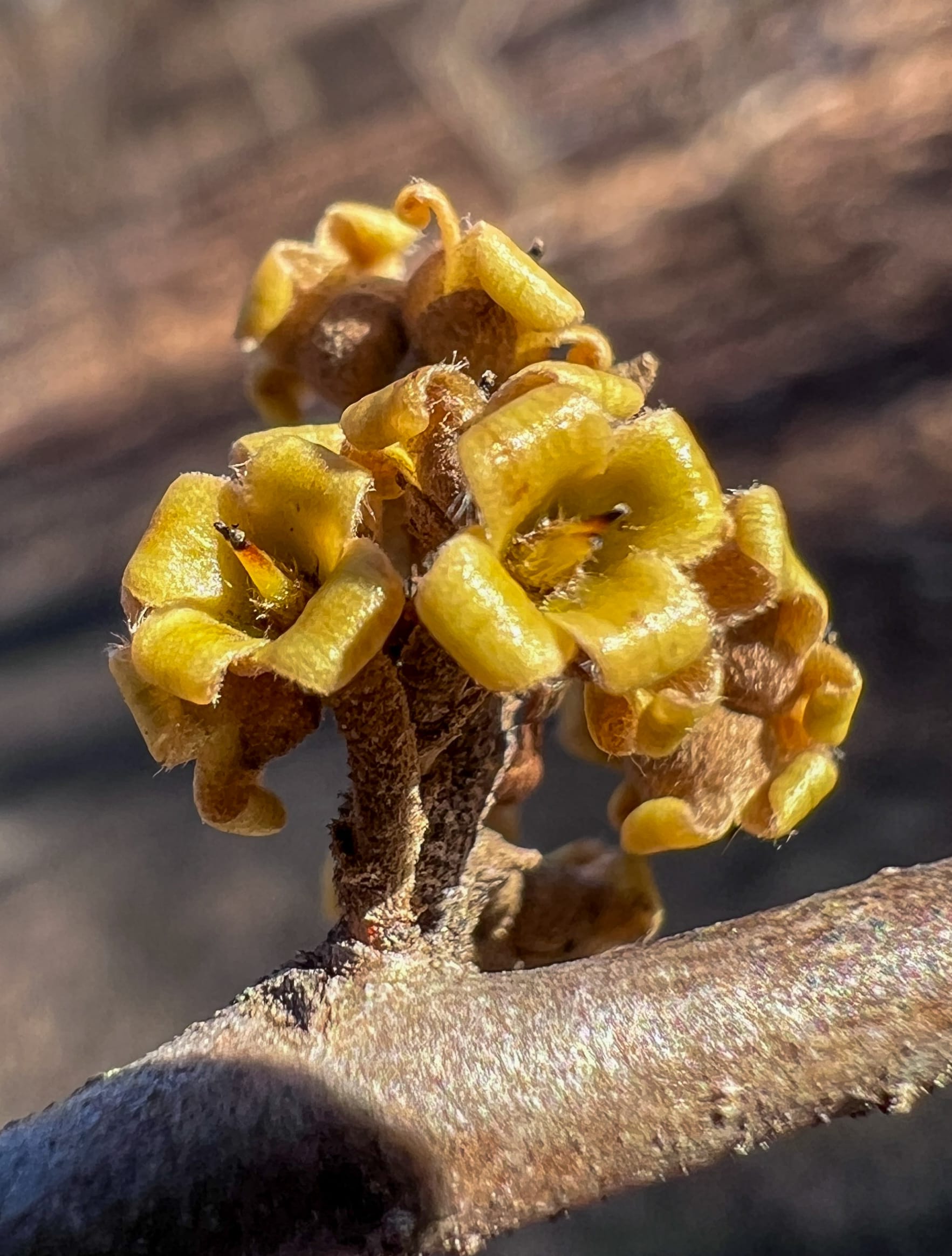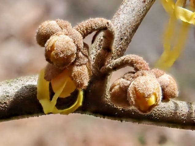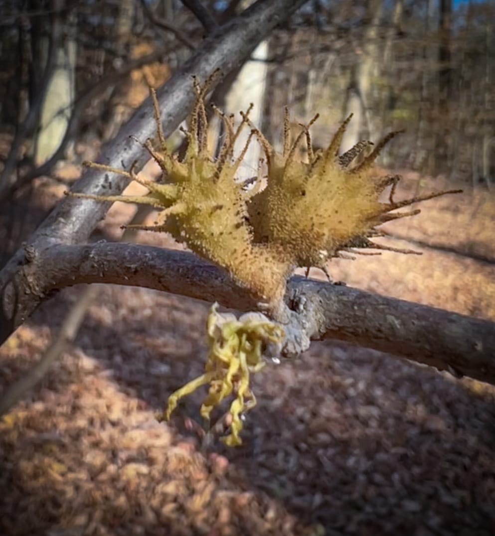 Witch hazel flower buds have been resting since they formed during the previous growing season. Once the leaves are off they bloom and attract pollinators like winter moths and the few hardy flies that remain active into early winter.