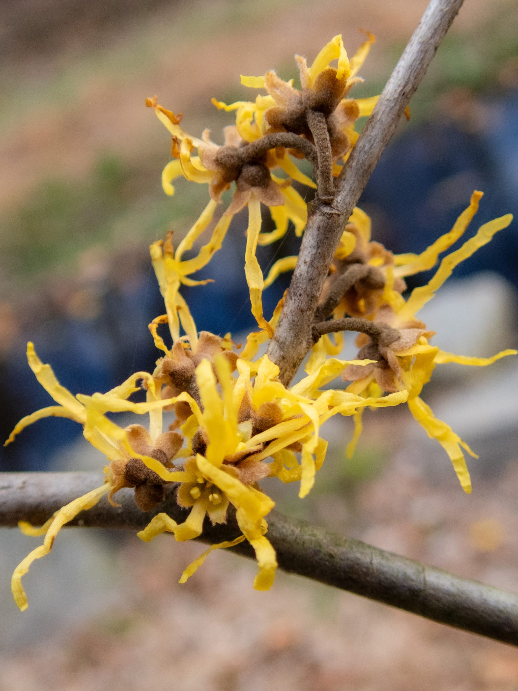 Witch hazel gains an evolutionary advantage by flowering during a time with fewer competing blossoms. Adapted for cold weather the long ribbony petals will roll up tight to survive frosty nights.