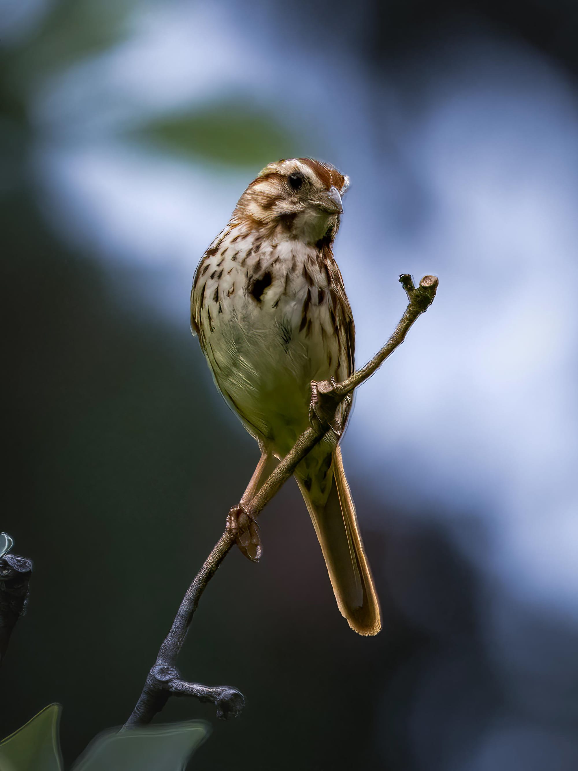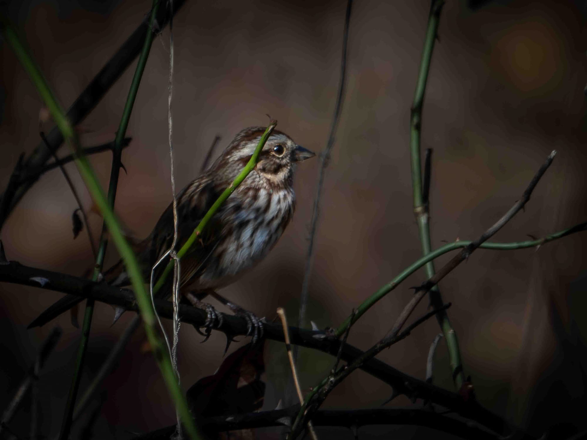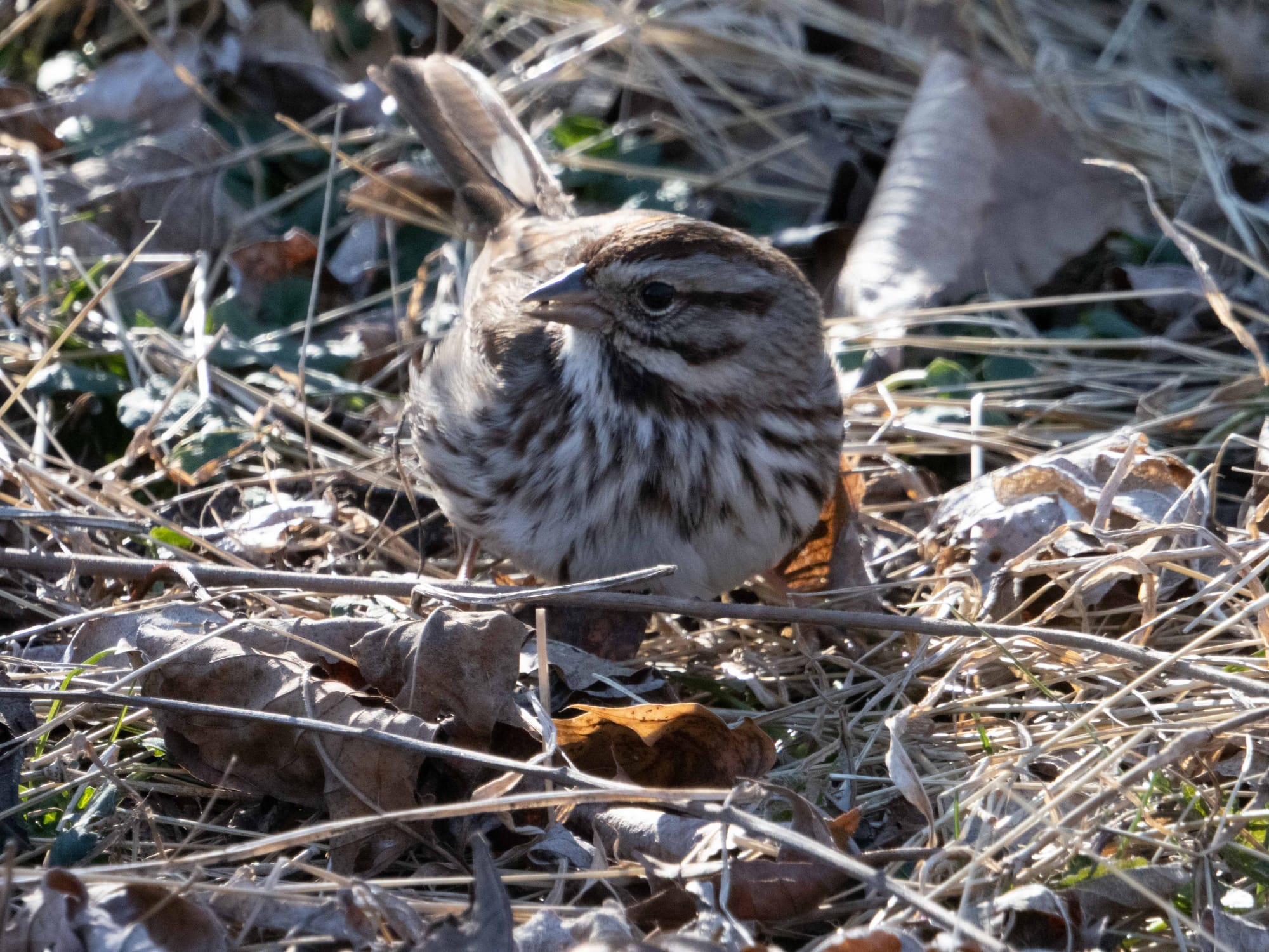 Song Sparrows are year round inhabitants of the park who share space with the visiting sparrows and juncos. Song Sparrows frequently perch just above the ground layer to watch for danger before returning to forage.