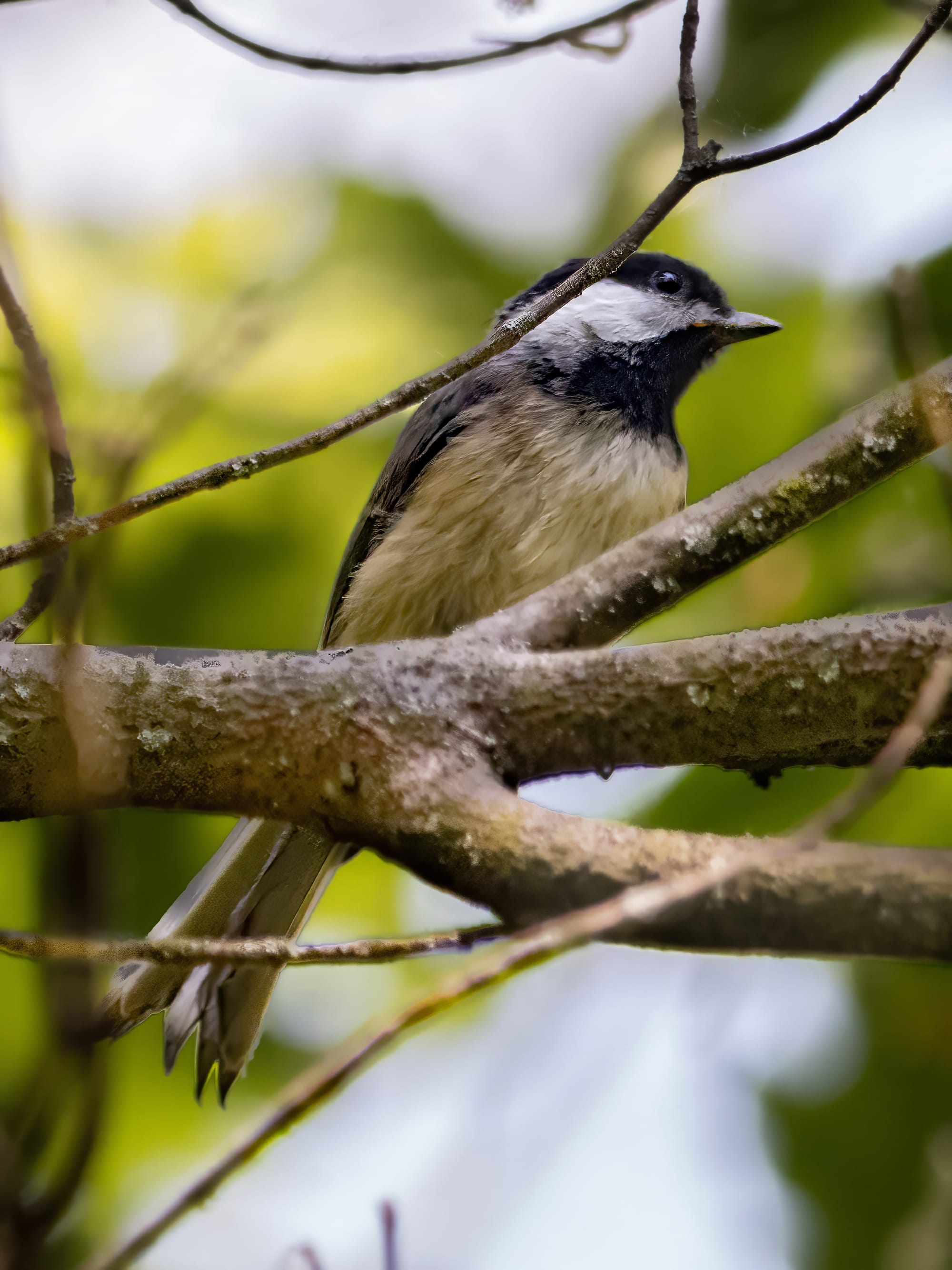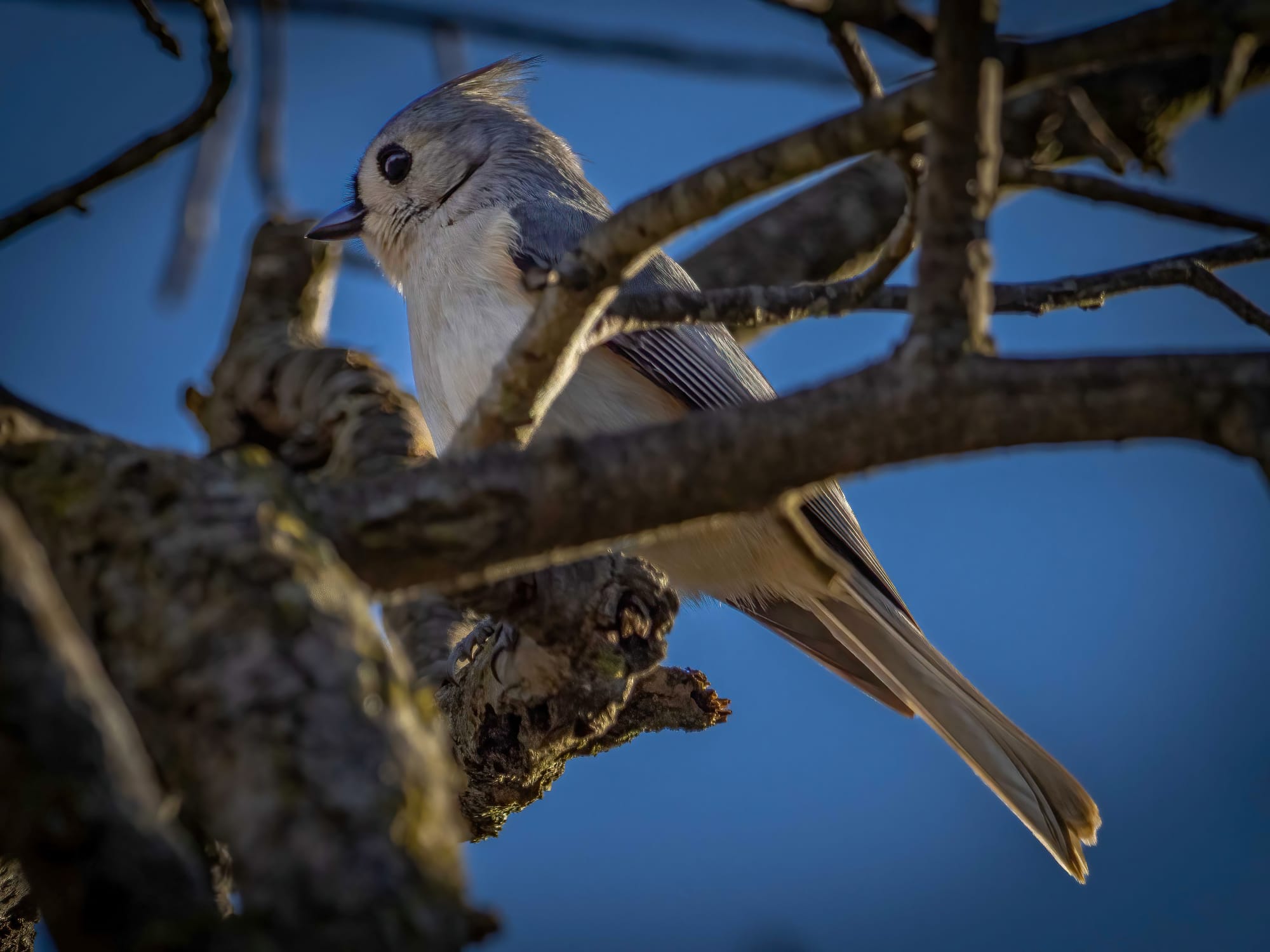 Tufted Titmice prefer the higher branches of the mid-canopy where they investigate galls, bark crevices, and clumps of dead leaves that hold dormant larvae. Their clear, piercing calls signal nearby chickadees and the group stays loosely together as they move through the forest.