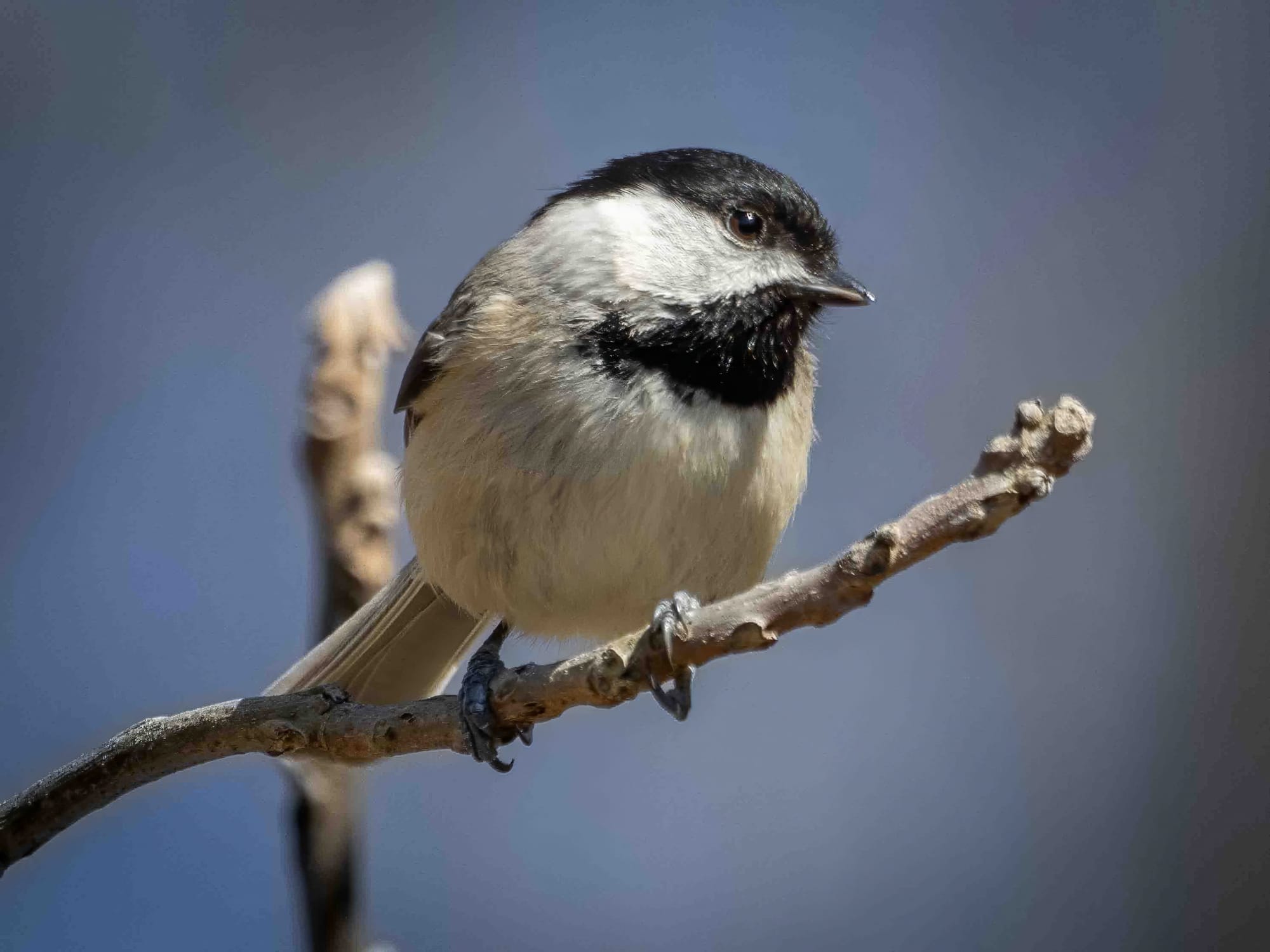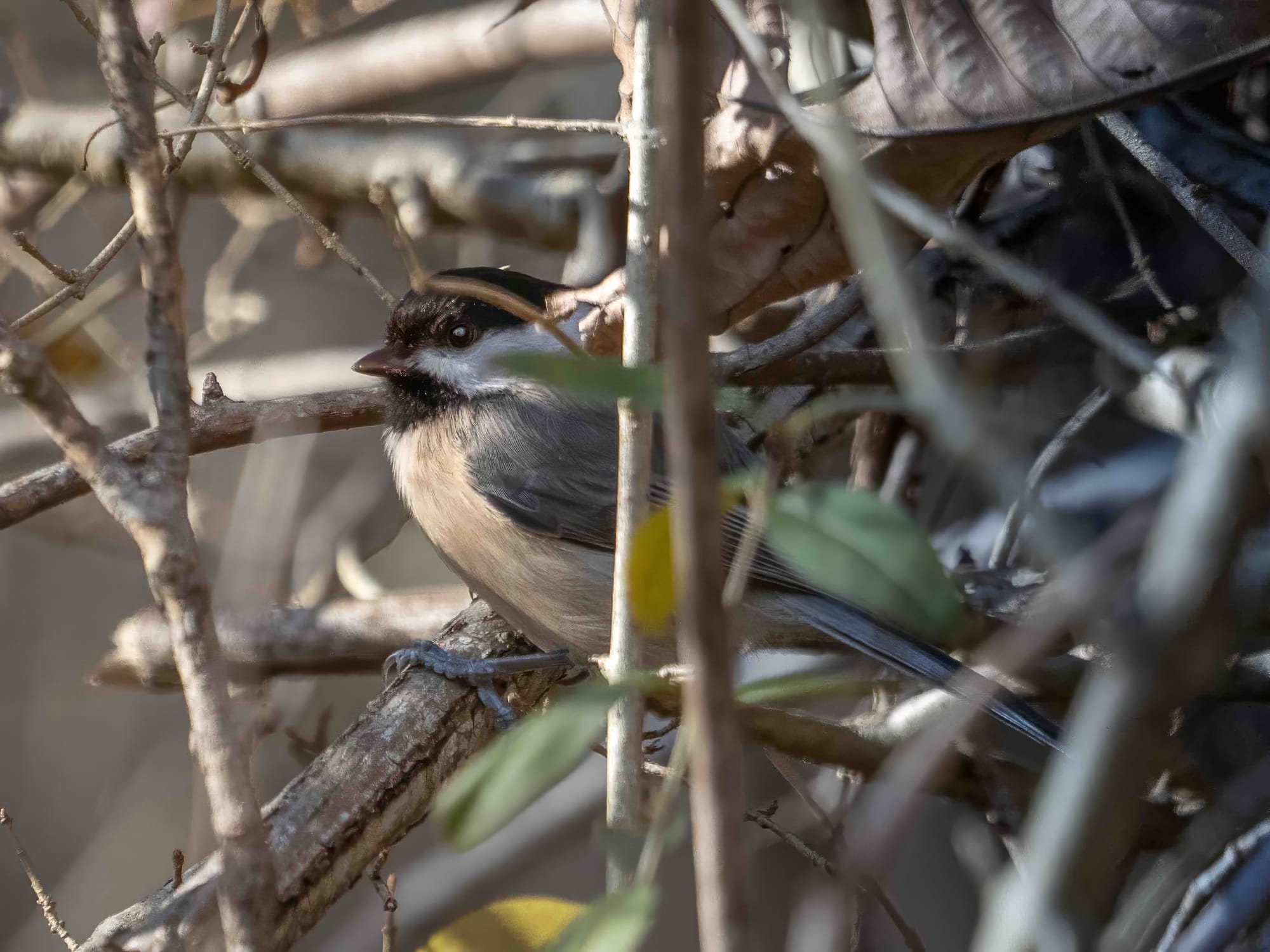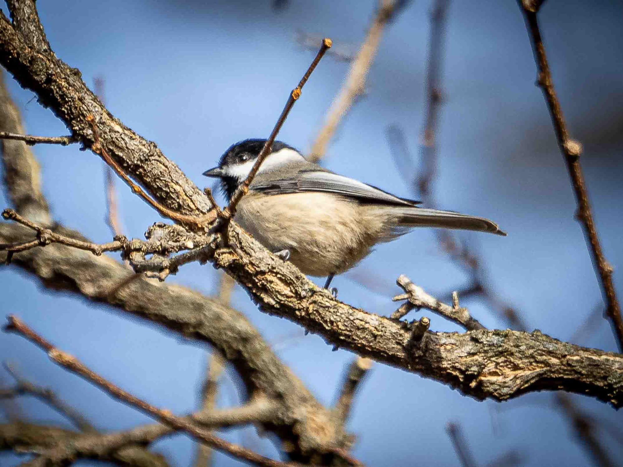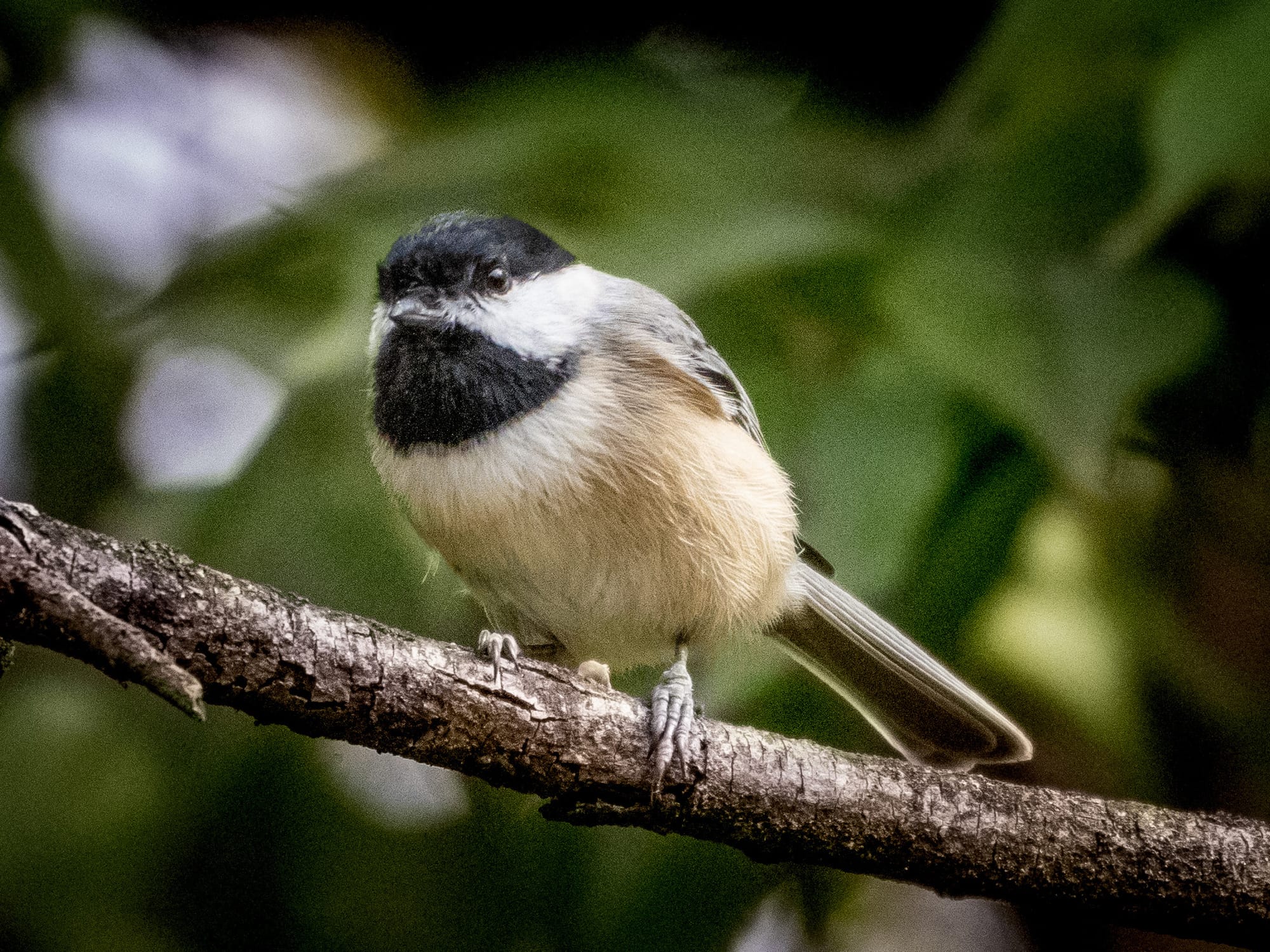 We live where the southernmost range of Black Capped Chickadee overlaps the northernmost extent of the Carolina Chickadee, and the two can produce hybrids. Carolina Chickadee calls rise a bit higher and flow more quickly; the spacing softens to something of a southern drawl. Black Capped Chickadees call with a bright, well-defined tone that has a Yankee crispness. I can’t often tell them apart myself, but a Chickadee is a Chickadee - bold yet always on the watch, moving fast, all business.