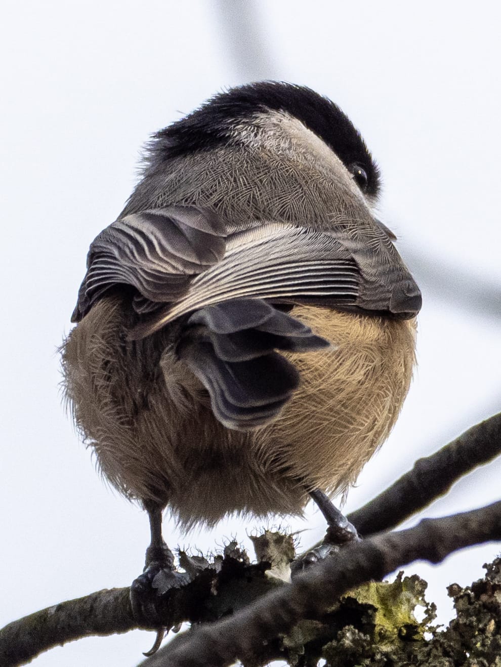 As they travel the Chickadees inspect bud scales, curled leaves, and bark seams where wintering insects shelter.